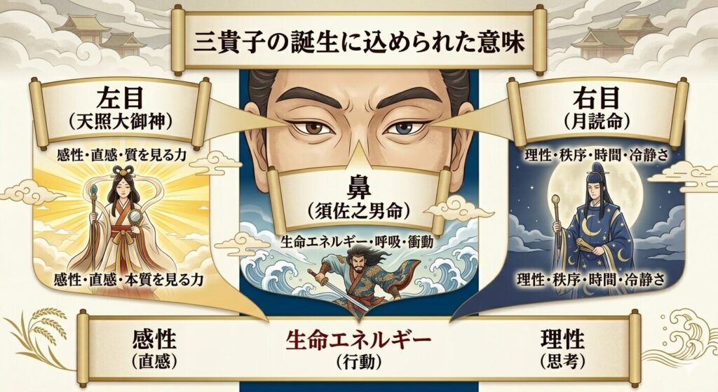 左目・右目・鼻から生まれたことには、象徴的な意味があるとも考えられています。