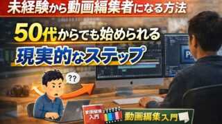 動画編集 未経験から動画編集者になる方法|50代からでも現実的に始めた実体験 50代・未経験から動画編集を始めた実体験をもとに、現実的なステップを解説。何から始めるか迷っている方へ、つまずいたポイントや乗り越え方まで具体的に紹介します。 2026.03.24 動画編集