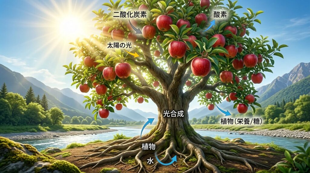 太陽の光によって植物が育ち、
